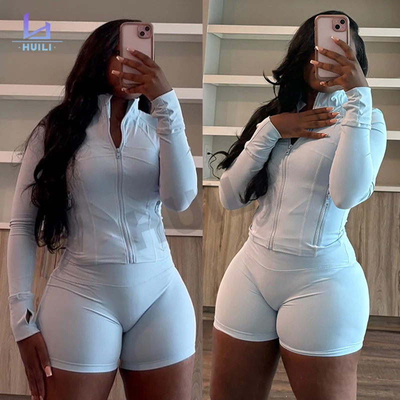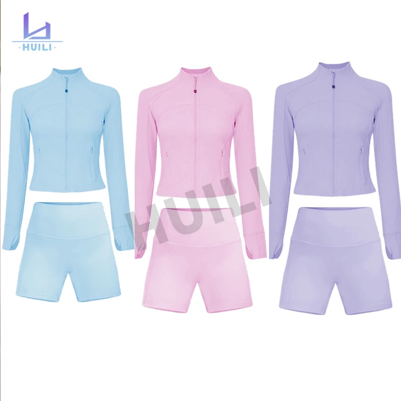 Huilin Women's Sports Shorts Set High Quality Zip Top Gym Tractusuit Stand Skinny Gym Legging Custom Logo for Spring/Summer